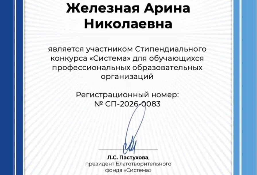 Студентка группы АТ-51, Арина Железная под руководством преподавателя Евгении Владимировны Ткаченко приняла участие в стипендиальном конкурсе «Система».
