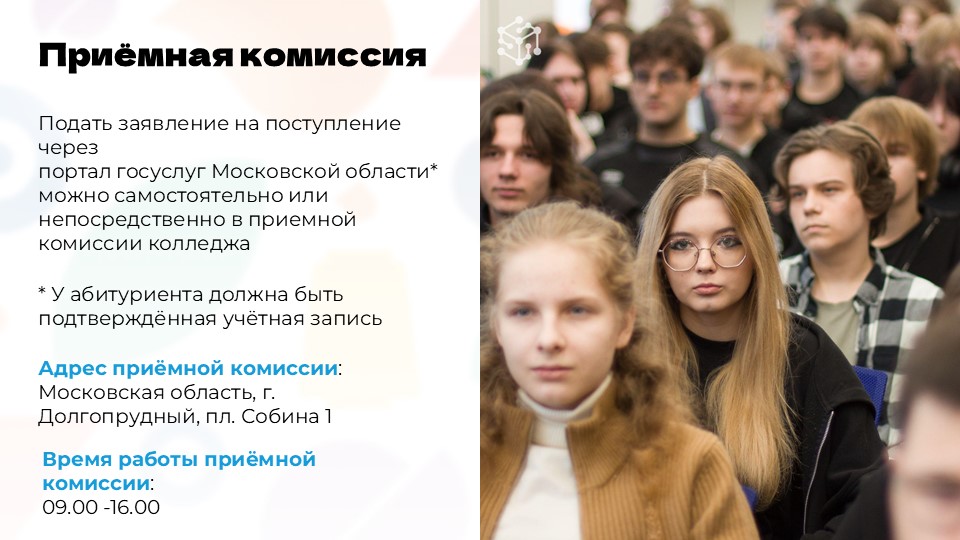 | 1 | 21.03.2026 | 10.00 | МО, г. Долгопрудный, пл.Собина, д.1 | Коршикова Анна Александровна | Заместитель директора | +7(495)369-45-93 |
